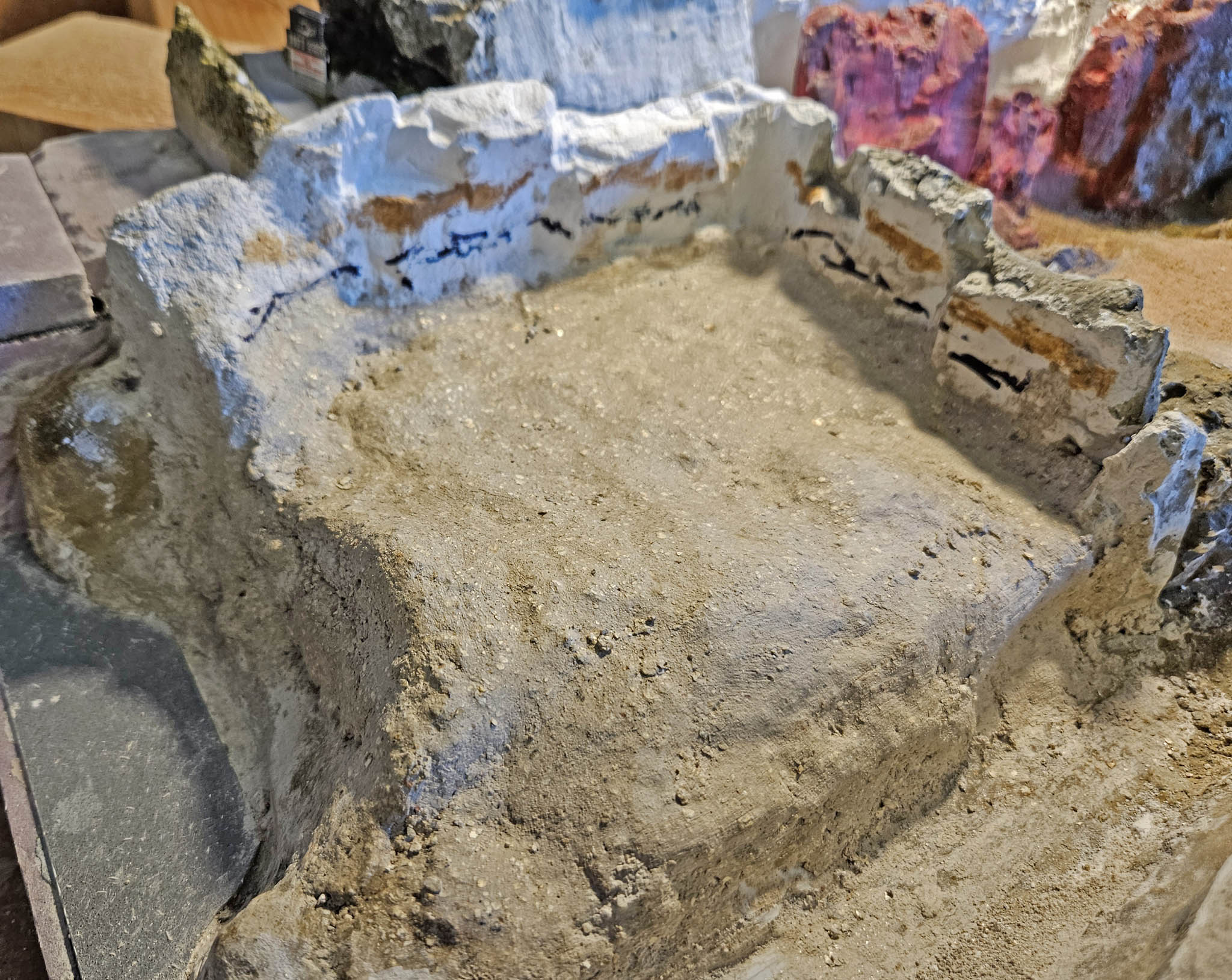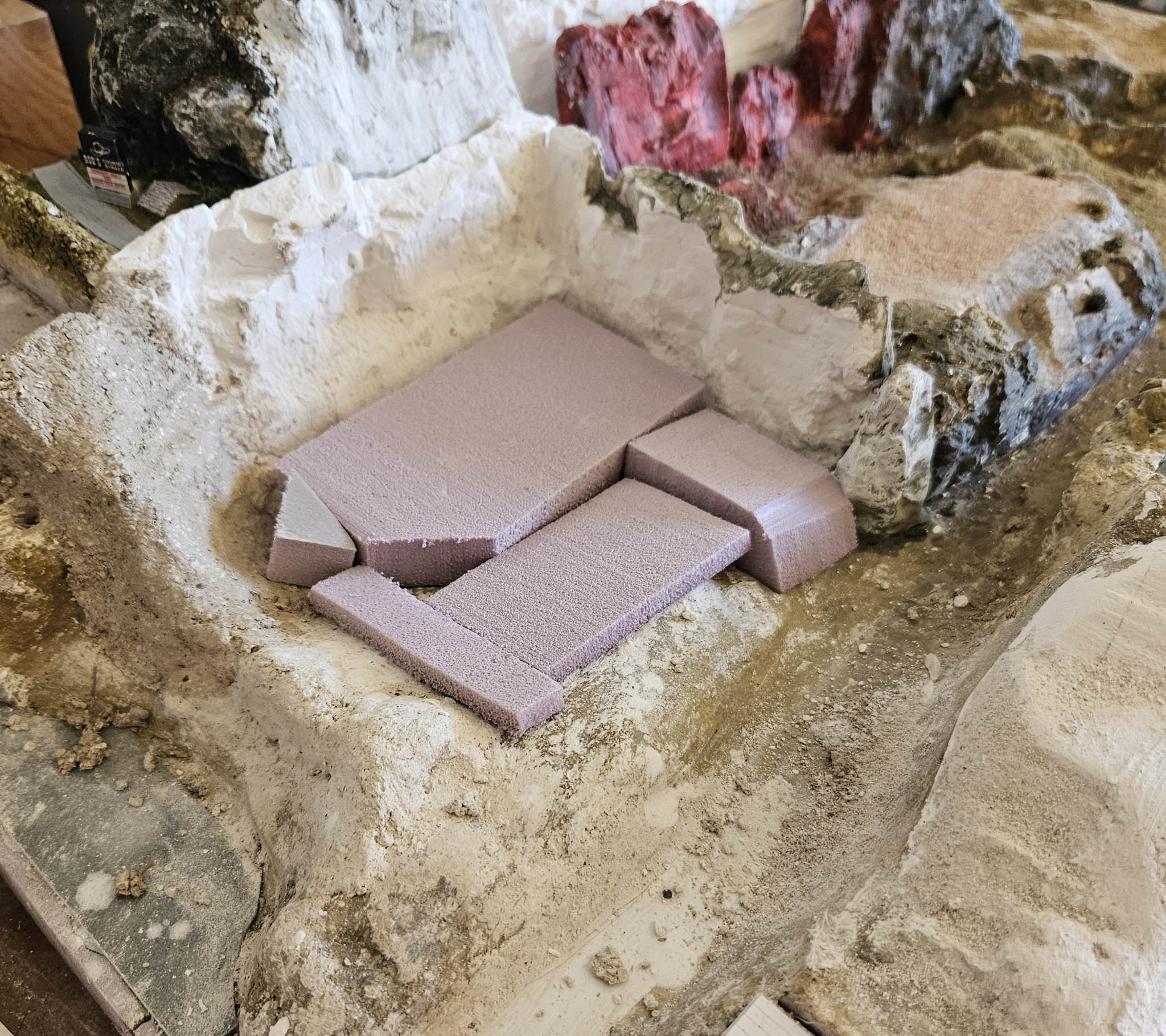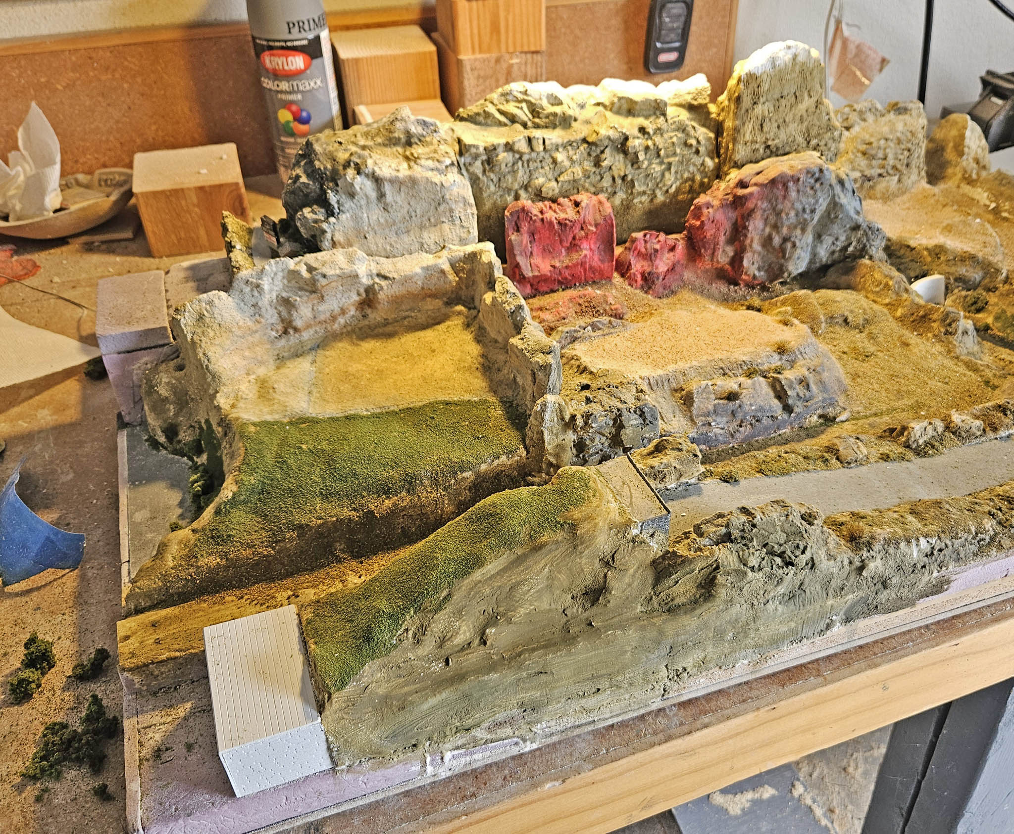 I often use Woodland Scenics Plaster Cloth to cover pink foam, MDF and other materials as a base layer in preparation for other plaster and scenery products. I've noticed that occasionally, after the Plaster Cloth dries on smooth, flat surfaces, it has a tendency not to stick and might start to lift. Since I had a relatively large area of smooth pink foam and MDF, I thought I'd try to first glue on a few pieces of course, mesh sandpaper (the kind that somewhat ironically is used to sand drywall plaster). Using a foam-safe glue, I put a few pieces down - without the intention to cover the entire area. I figured that the plaster from the Plaster Cloth will seep around the strands of the mesh, which is glued to the surface and create a strong bond. I don't know if it was really necessary, but after the Plaster Cloth dried it seems to be very secure.