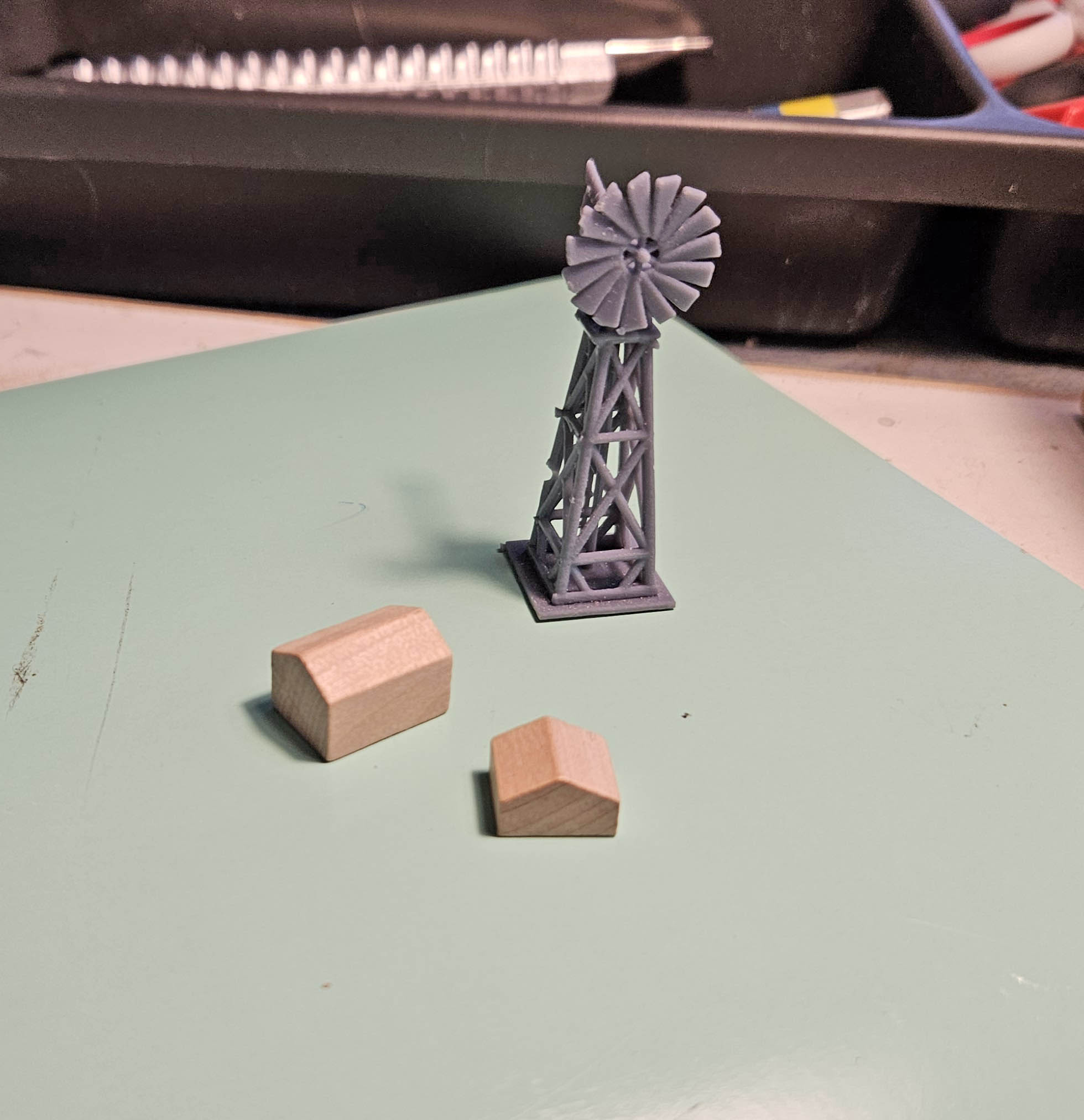 My original mock-up for a farm was way too big, so I put together some very small pieces of wood and plastic, and built a tiny windmill creating the “looking down from a plane” feeling I thought would be appropriate.