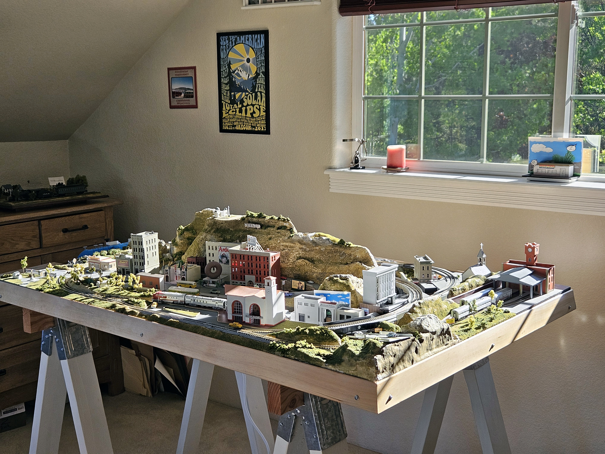 Since I spent almost 40 years in Los Angeles, it is only natural that it fills the most real estate on this layout. The theoretical entrance is a sloping freeway at the front, right corner. It was actually one of the last sections I completed. As such, I had to take some abstract liberties such as a ridiculously steep road angle, and a lift-off section to allow for trains heading to and from Dearborn Station. But I think it gives the rest of the layout a good “flavor,” if you know what I mean.